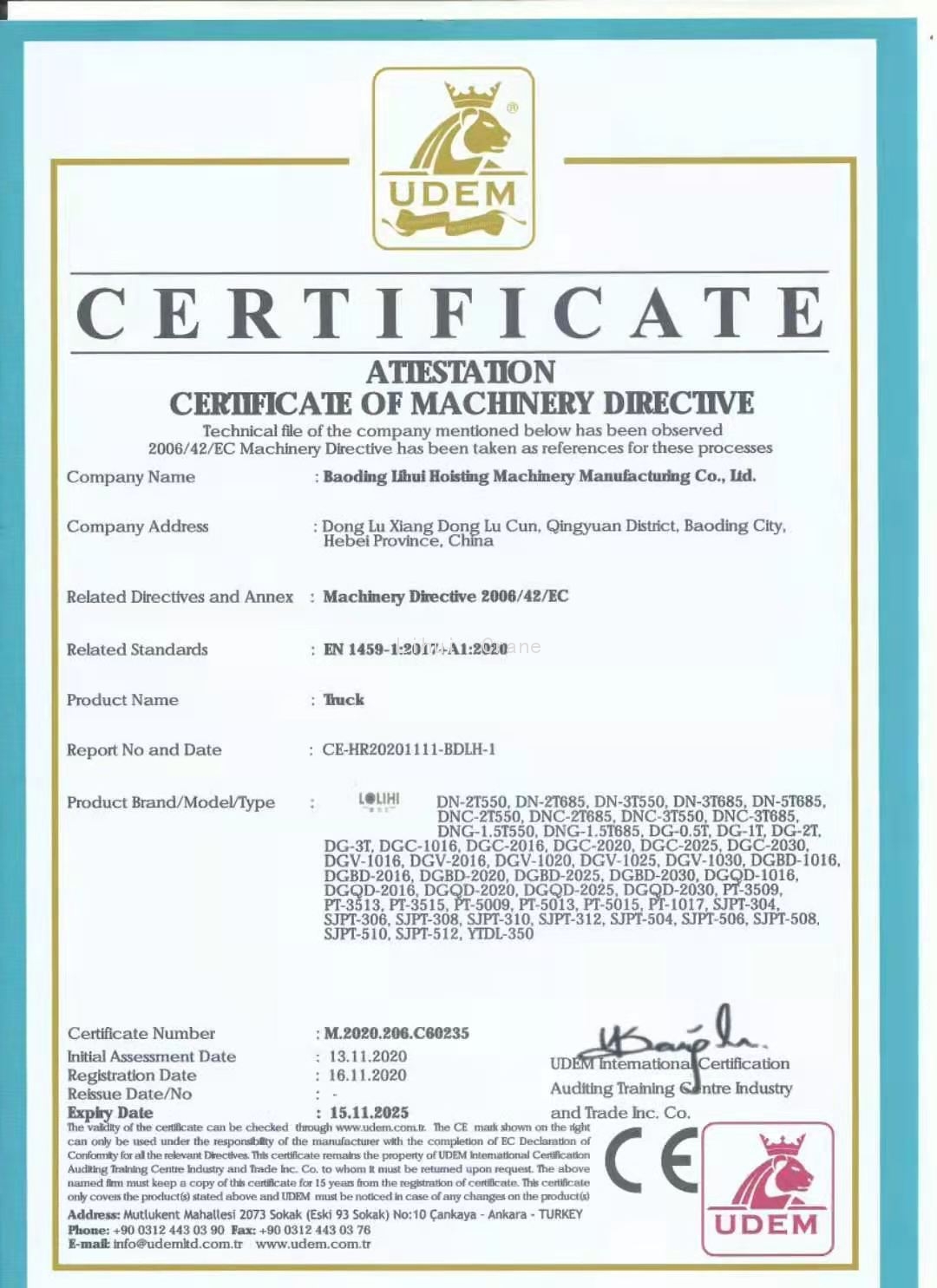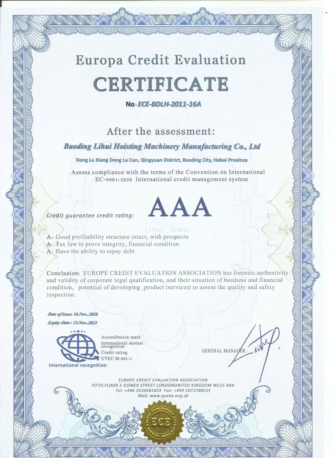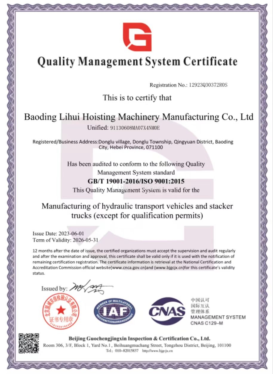 HeBei Baoding Lihui Lifting Machinery Co. Ltd. is located in Donglv Development Zone, Qingyuan County, Baoding City, Hebei Province. Established in 2005, the company is a large comprehensive enterprise integrating the design, research, development, manufacturing, sales, and service of lifting machinery. Our main products include: hydraulic forklifts, electric forklifts, barrel tippers, pallet jacks, mobile goods lifts, hydraulic guide rail goods lifts, gantry cranes, large cranes, various indoor cranes, outdoor cranes, lifting machines, hoists, mini electric hoists, and various lifting accessories. We also accept custom orders for non-standard products. Our products have obtained EU CE certification and ISO9001 quality management system certification. The company has been rated as an AAA-level credit enterprise in corporate credit evaluation. |