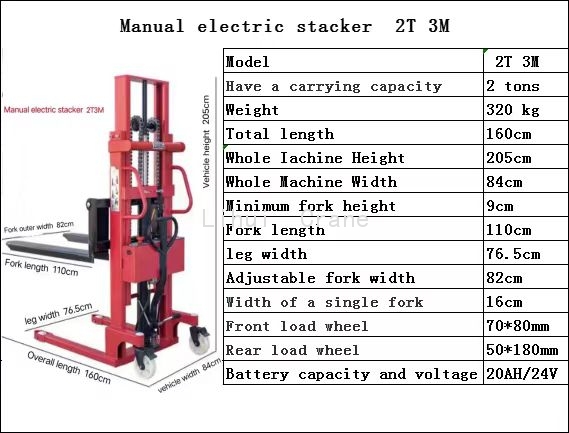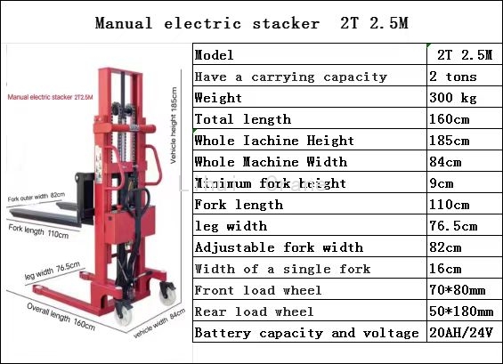 Manual electric double-use stacker,Stacking car that can be lifted manually or electrically.The whole vehicle adopts national standard thickened steel.Solid shaft piston rod hydraulic cylinder,Import sealing ring,Low probability of oil leakage,Strong load capacity,Tianneng maintenance-free storage battery,Long service life.Specification